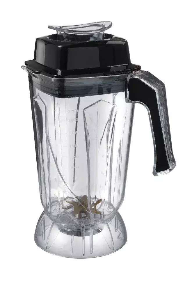 Austauschbehälter für Standmixer 230718/230695/230688. Bruchfester Polykarbonat-Behälter mit 2,5 l Fassungsvermögen, fester Deckel aus PBT und kleine Polykarbonat-Deckelabdeckung. Mixerblätter aus Edelstahl mit Titanbeschichtung.