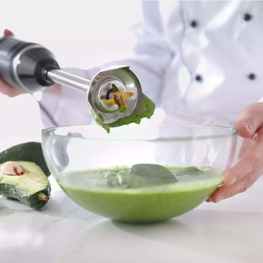 Professionelle Ausführung. Gehäuse aus faserverstärktem Nylon. Edelstahlstab und -messer. Lieferung inklusive Schneebesen (290 mm). Schneller Zubehörwechsel dank der Kupplung. Einfach zu reinigen. Mit ergonomisch geformtem Griff. Stab und Messer aus Edelstahl, Länge: 250 mm. Geeignet für bis zu 20 Liter. Regler für die Geschwindigkeit: 2500 – 15000 U/Min. Gewicht 1,90 kg.