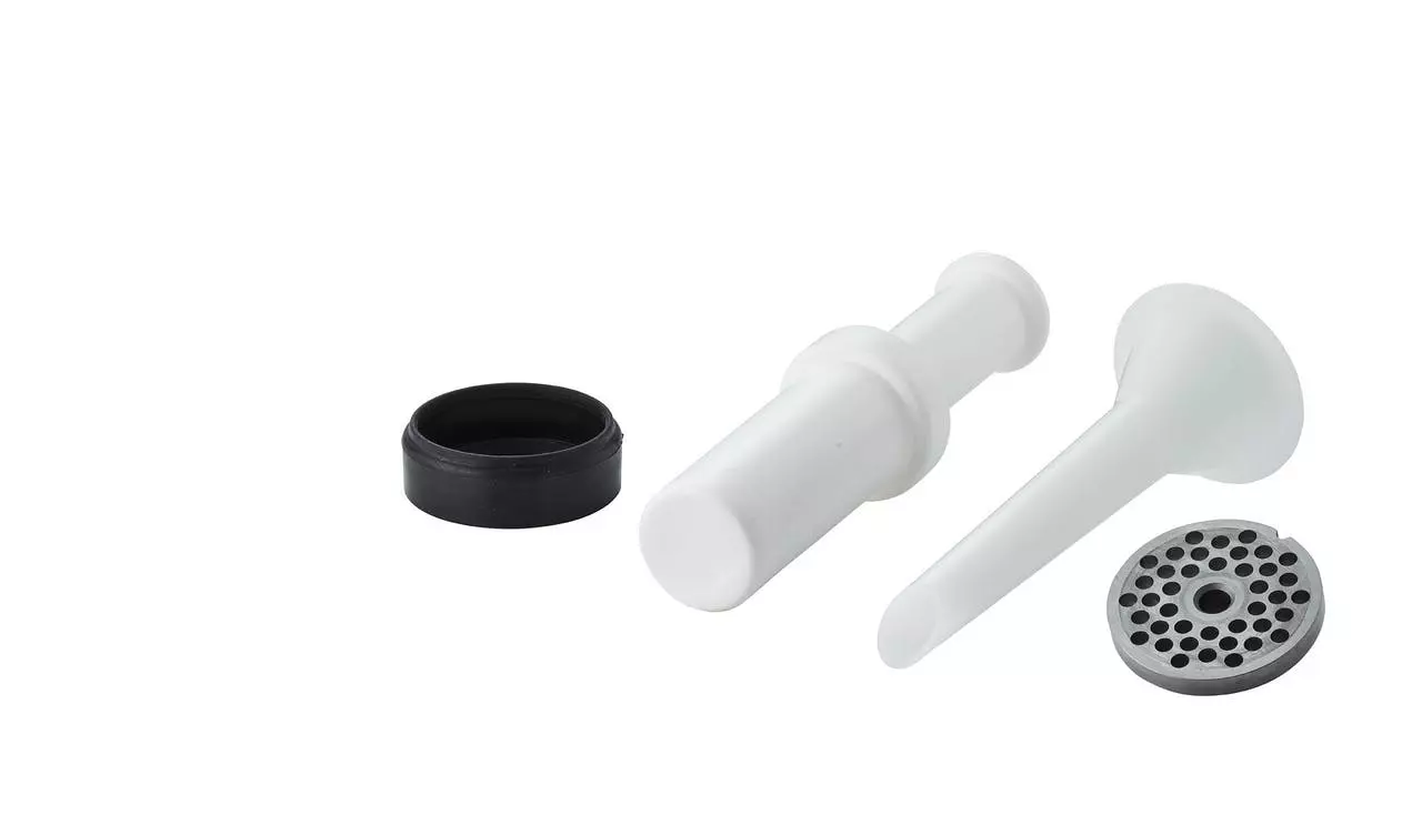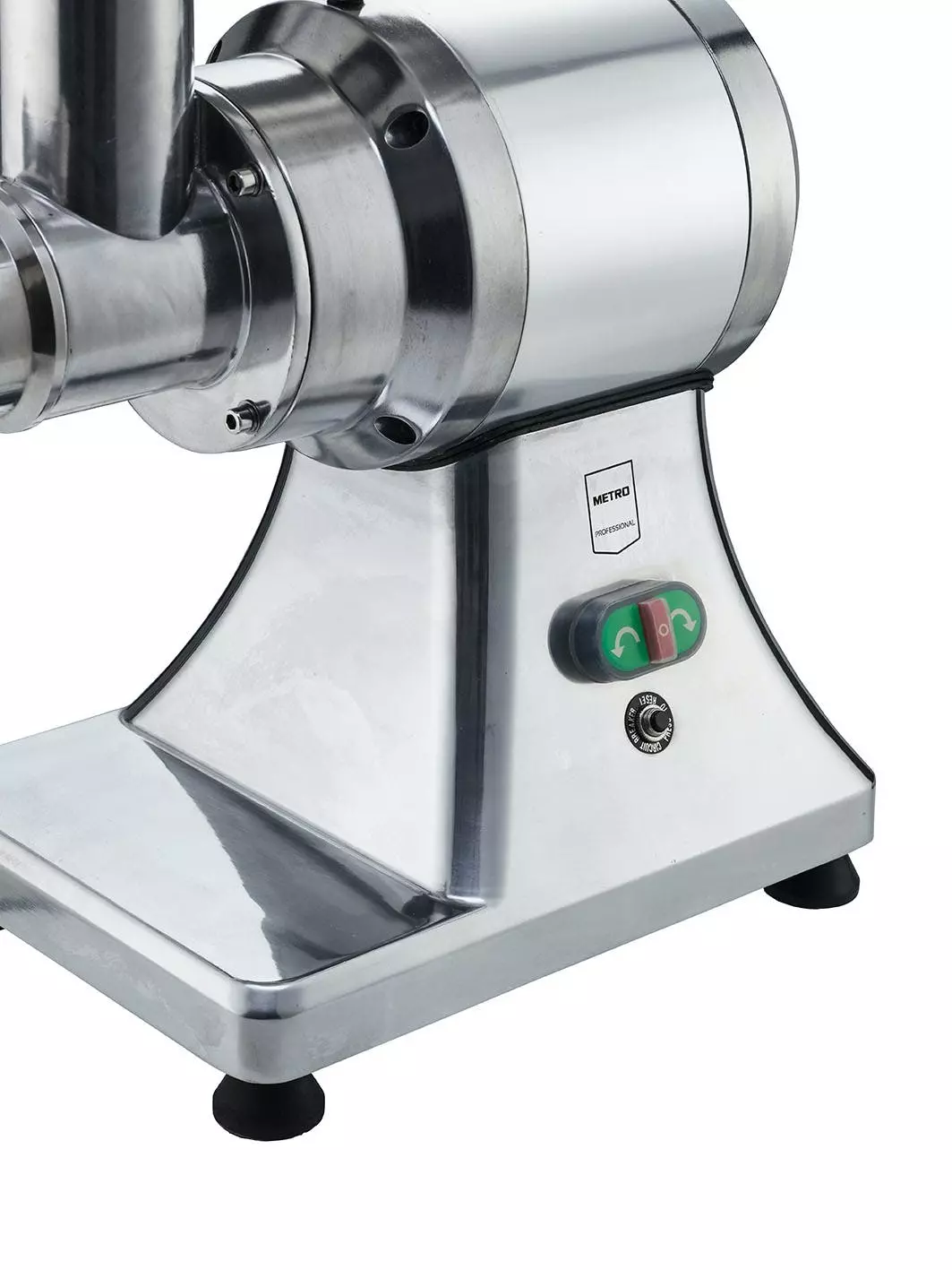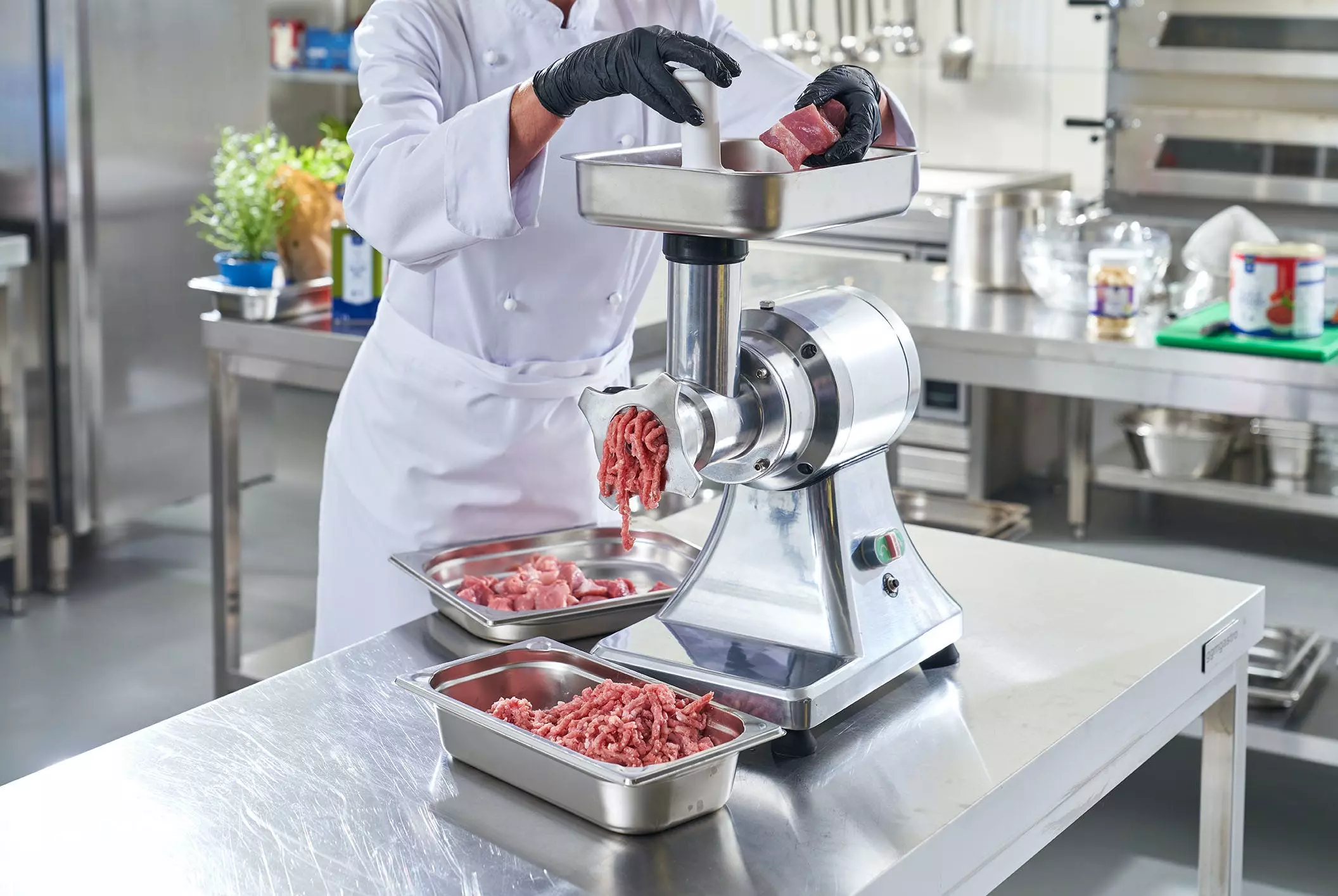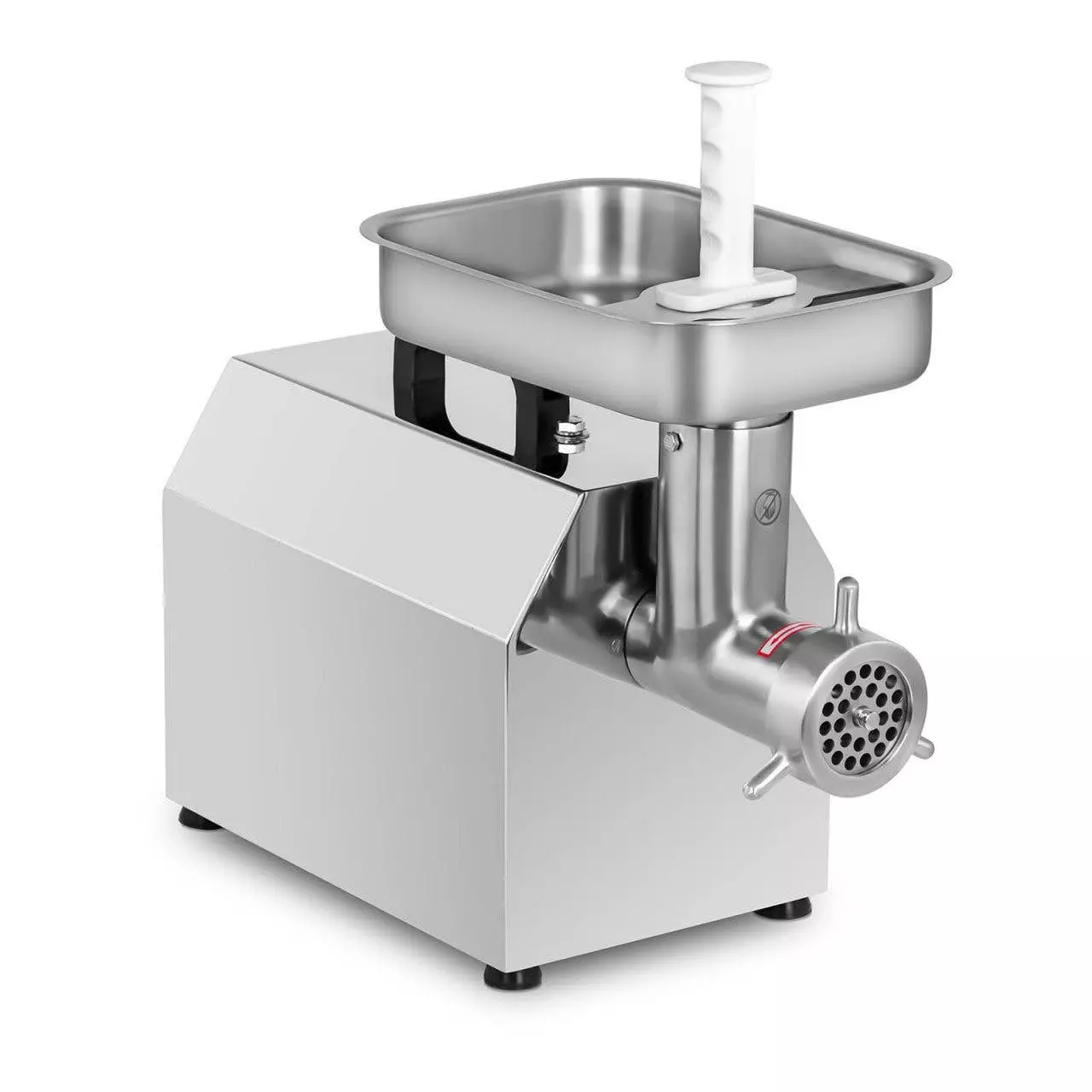 Feingehacktes mit dem METRO Professional-Fleischwolf Hackfleisch für Burger, Lasagne oder leckere Bolognese-Saucen in großen Mengen sind ein Kinderspiel für diesen hochwertigen Profi Fleischwolf. Dank 550-W-Elektromotor zerkleinert das Gerät bis zu 100 kg/h an Fleisch in feinstes Gehacktes – je nach Lochscheibe mit 4.5, 6 und 8 mm Löchern Durchmesser. Sollten einmal Lebensmittel im Fleischwolf feststecken, werden sie dank der Rücklauffunktion der Schneckenwelle gelöst und entfernt. Um solche Verstopfungen möglichst zu vermeiden, sollte man das Fleisch zuvor in kleinere Stücke schneiden. Sie können die aus lebensmittelechtem und pflegeleichtem Edelstahl gefertigten Messer und Lochscheiben leicht aus dem Fleischwolf Gastro ausbauen und reinigen. Für sicheres Arbeiten sorgt der Fleischstopfer aus stabilem Kunststoff, mit dem Sie Fleisch, Gemüse oder Früchte auf der großen Ablagefläche in den Einschub drücken. Lüftungsschlitze im Gehäuse sorgen auch bei Dauerbetrieb für ausreichend Kühlung. Sollte der Motor dennoch einmal zu heiß werden, schaltet ihn der eingebaute überhitzungsschutz automatisch ab (kontinuierliche Betriebszeit: 45 min, Ruhezeit: 15 min).
