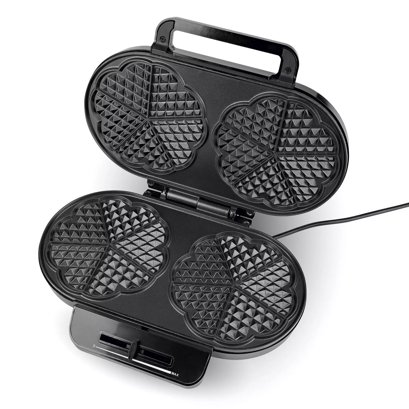 Für den großen Waffelgenuss zu Hause gibt es jetzt das MAXXMEE Doppel-Waffeleisen – ideal z. B. beim Brunchen, zu Geburtstagen und Familienfeiern. Die Kontrollleuchte zeigt dir an, wann die optimale Backtemperatur erreicht ist. Jetzt den Waffelteig auf der Backfläche verteilen, Deckel schließen…und nur wenige Augenblicke später duftend frische Herzwaffeln genießen. Per Schiebregler kannst du die Temperatur und damit auch den Bräunungsgrad deiner Waffeln individuell einstellen.