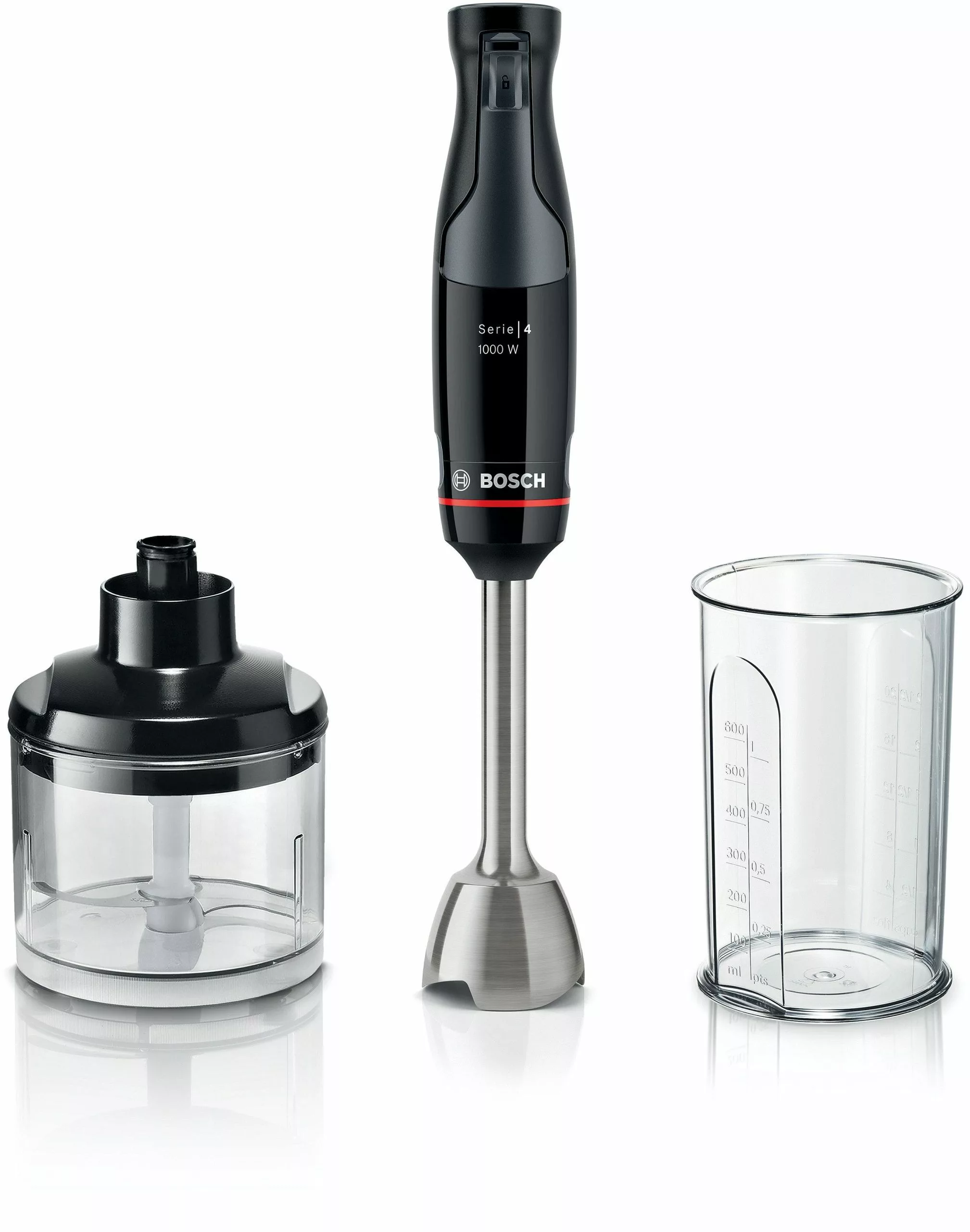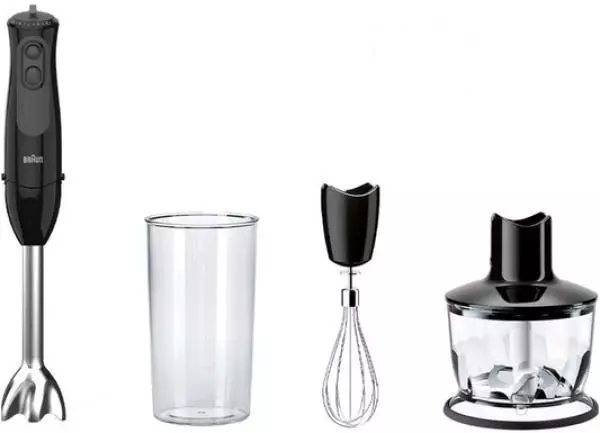 Lieferumfang: 1 x Motoreinheit, 1 x Stabmixer-Aufsatz, 1 x Schneebesen-Aufsatz,1 x Multizerkleinerer-Aufsatz mit Behälter, 1x Edelstahl-Schneidklinge, 1 x Messbecher (700 ml), 1 x Verbindungsstück