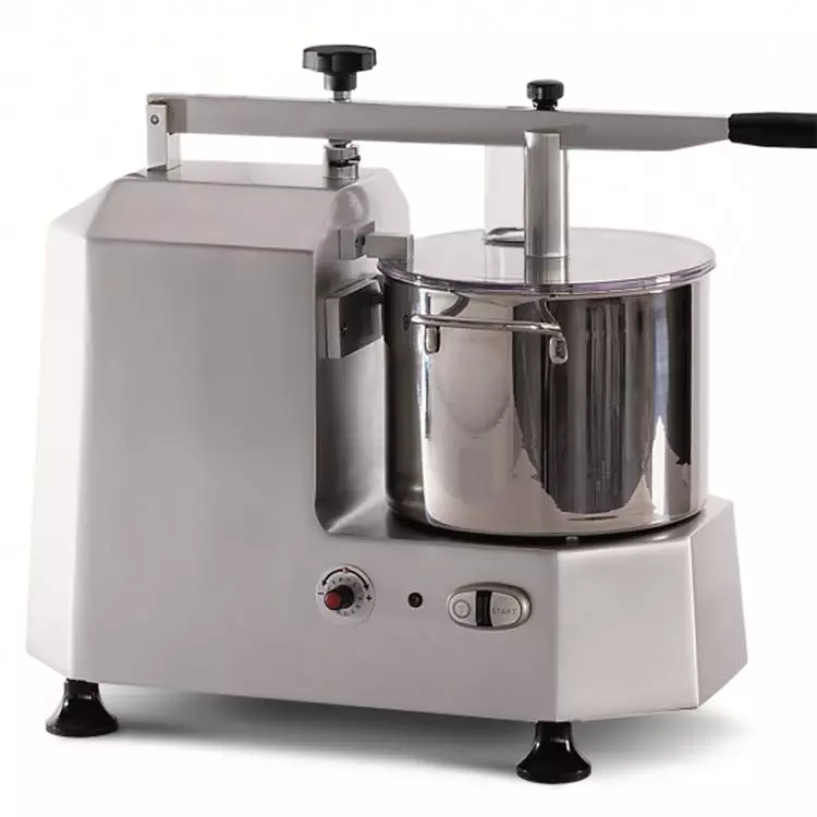 Blixer® 5 – 2V. Dreiphasig 400V/50/3. Leistung 1500 W. 2 Drehzahlen 1500 und 3000 U/min. 5,9-Liter-Schüssel aus Edelstahl mit Griff und tief liegendem Messer mit 2 gekerbten Klingen. Dichter Deckel mit Blixer®-Paddel. 3 bis 20 200-g-Portionen.