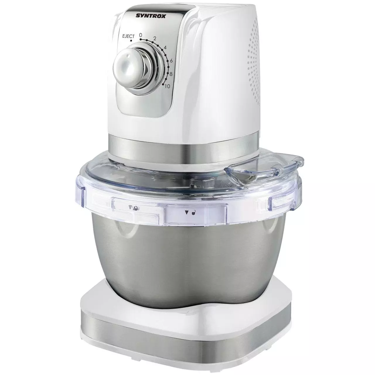Küchenmaschine mit Edelstahl-BehälterAus dem Hause Syntrox Germany gibt es jede Menge Küchenmaschinen und Knetmaschinen zu guten Konditionen. Benötigen Sie eine neue und hochwertige Küchenmaschine, sind Sie in hier also genau richtig. Es gibt die Küchenmaschine mit Edelstahl-Behälter zu guten Konditionen. Im schicken Design kommt die Küchenmaschine mit einem Edelstahl-Behälter daher. Natürlich ist bei solch einer Küchenmaschine und Knetmaschine nicht das Design das Ausschlaggebende. Viel interessanter und wichtiger sind die Funktionen, die die Küchenmaschine beinhaltet. Die Küchenmaschine mit 600 Watt und dem 4 Liter Edelstahl-Behälter ist jedenfalls mit vielen Funktionen bespickt und äußerst praktisch.Besonderheiten der KüchenmaschineDie Küchenmaschine mit dem 4 Liter Edelstahl-Behälter ist mit einigen Extras versehen, die sie besonders praktisch machen und ein komfortables Arbeiten gewährleisten. Solch eine Knetmaschine und Küchenmaschine eignet sich vor allem für viele verschiedene Arbeiten. Sie können mit der Küchenmaschine mit 4 Liter Rührschüssel aus Edelstahl: • Kneten • Rühren • Mischen • SchlagenEs ist demzufolge ein multifunktionelle und exklusive Küchenmaschine, mit der Sie Teige aller Art bearbeiten können. Sie bekommen zusammen mit der Basiseinheit und der Motoreinheit im Paket die Edelstahl-Rührschüssel und viele verschiedene Zubehörteile. Enthalten sind Knethaken, Rühreinsatz und Schneebesen. Sie können aufgrund der vielen Zubehörteile leichte und schwere Teige kneten. Nehmen Sie einfach die Knethaken für die schweren Teige und die Rühreinheit für leichte Teige. Mit dem Schneebesen schlagen Sie beispielsweise Sahne und Eiweiß auf Knopfdruck. Versehen ist die Küchenmaschine mit 600 Watt mit insgesamt 10 Geschwindigkeitsstufen. Knethaken verwenden Sie mit Stufe 1 bis 4. Die Rühreinheit bringen Sie mit den Geschwindigkeitsstufen 1 bis 6 in Funktion und den Schneebesen verwenden Sie mit Stufe 7 bis 10. Sie müssen noch zwischendurch Zutaten hinzugeben? Das ist kein Problem, da sich im Deckel der Rührschüssel eine Öffnung für das Einfüllen weitere Zutaten befindet. In der Küche sollte also solch eine Küchenmaschine und Knetmaschine keinesfalls fehlen. Sind Sie mit den Arbeiten fertig, reinigen Sie die Küchenmaschine und Knetmaschine ganz komfortabel. Sie zerlegen das Gerät komplett und schon können Sie die einzelnen Teile säubern.Eigenschaften: • 600 W, 220-240 V~, 50 Hz • Bajonettverschluss • 10 Geschwindigkeitsstufen • Maße Verpackung (LxBxH): 28 x 28 x 40 cm • Farbe: Creme • Kabellänge: 1,1 m • Gewicht: 5,24 kgLieferumfang: • Basis • Rührschüssel aus Edelstahl • Abdeckung mit Öffnung zur Zutatenbefüllung • Motoreinheit • Knethaken • Rühreinsatz • Schneebesen • Bedienungsanleitung (de/en)